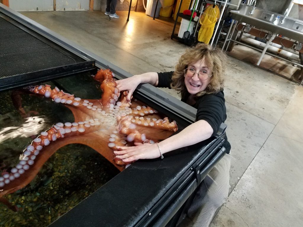 [00:03:33] So I started in March of 2011 by visiting New England Aquarium and asking to see if I could meet their octopus Athena, a giant Pacific octopus. I was going to write an article for a magazine to start with, but in my heart I hoped it might turn into a book, but I had no idea what to expect. And Scott Dowd the aquarist there, opened the lid of Athena’s tank, and I saw this beautiful 40 pound creature emerge from her lair, turn bright red with excitement, and I watched her silvery eyes lock into my face, and she came over and started reaching up toward me with her beautiful white suckers. So, I plunged my hands and arms into the 47 degree water, which was very freezing, and soon found my skin covered with their beautiful, white, soft suckers.