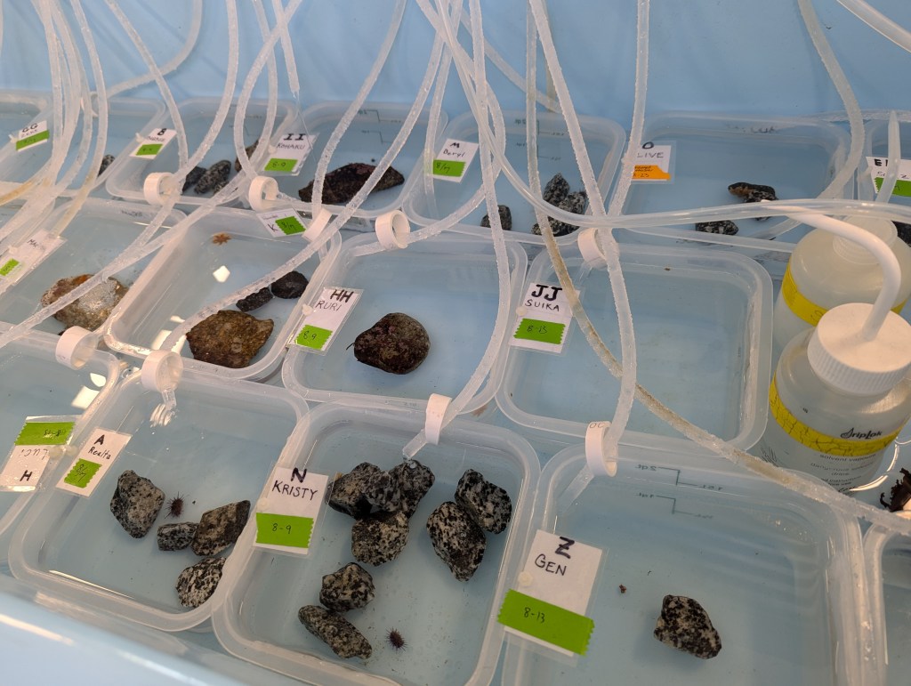 [01:05:46] Vince Christian: We kind of keep a continuous culture. we’ve got seven, for each day of the week. So we have a lot of replication, but we take the oldest one, which, we’ll do this one today, and we take, two and a half liters of seawater, which we’ve sterilized, in sterilized containers, We put a milliliter of bleach to make sure there’s no bacteria in the water.