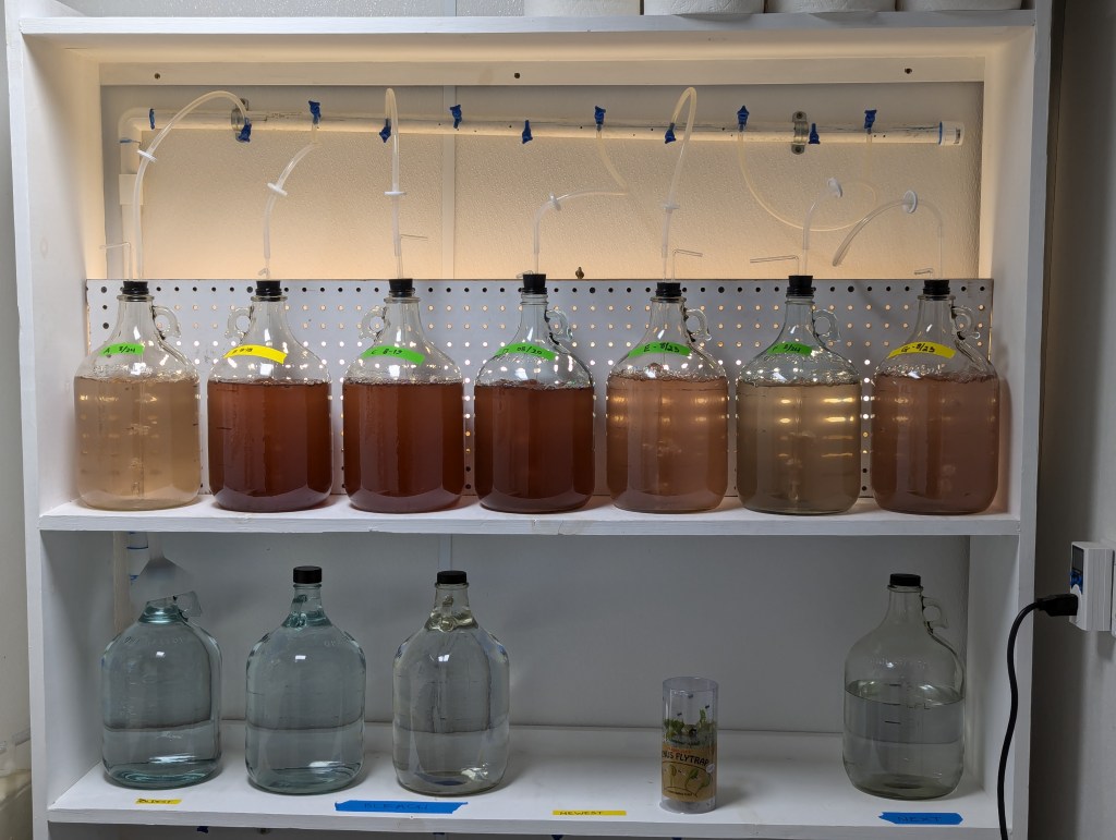 [01:04:55] homebrewing algae, here at the laboratory. And you can see shades going from very light brown to kind of an orangish hue to more of a dark brown. And so, you have a higher density of these microalgae in the the darker colored growlers that we have on the shelf. And there’s dates on them, which refer to when they were split, I believe.
