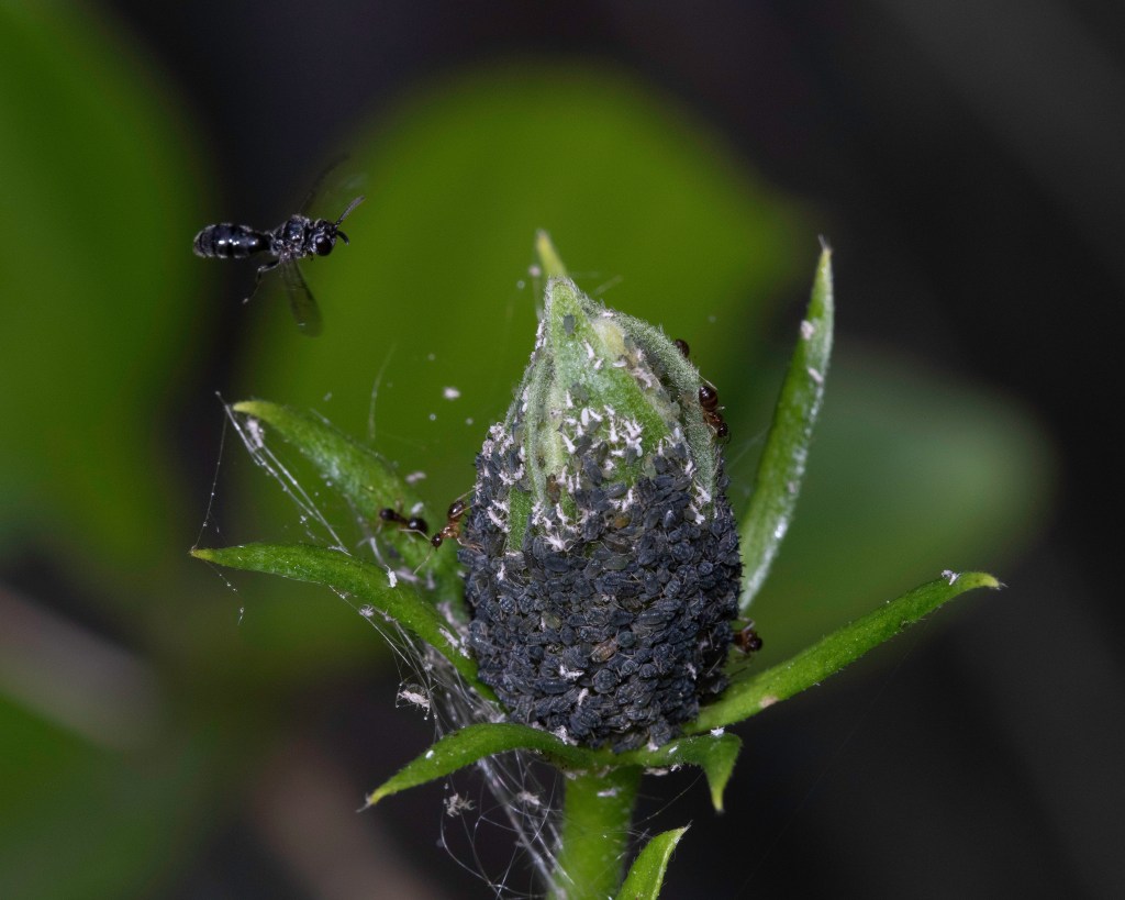 [00:43:07] on a plant. And I think it was Argentine ants, though it may have been different ants that were protecting these aphids. And while I was watching with my camera, thankfully, I an aphid wasp came and it was buzzing around the aphids and the ants, when the wasp would get too close, they would rear up and start to wave their legs around.
